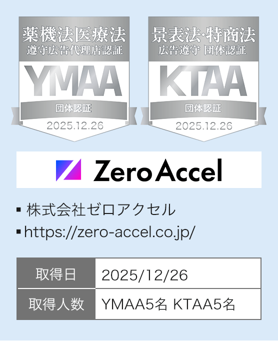 YMAAマークは薬機法・医療法の広告、KTAAマークは広告の景表法についての広告代理店や広告担当者向けの認証マークです。