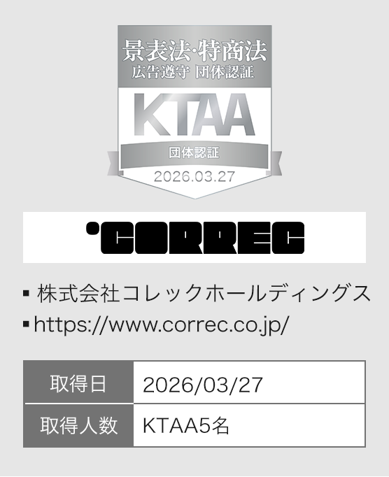 KTAA団体認証マークは1企業に一定以上のKTAA認証資格者が在籍する企業、及び、私どもの活動にご賛同いただき協賛金をお支払いいただいた企業に対して付与されます。